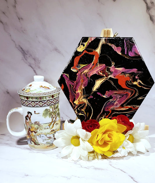 Black & Gold Swirls Hand Crafted Ceramic Trivet Hot Pad for Hot Pots and Pans, Kitchen Decor for Table, Heat Resistant Cork Mat Bottom, Heat Resistant Seal (Hexagon Shaped - 6.75" x 7.75" x .5")