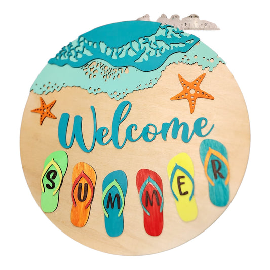 "Summer Vibes Welcome Sign — 12” Round Bright Flip-Flop Wall Decor in Colorful Blue, Red, Yellow & Green