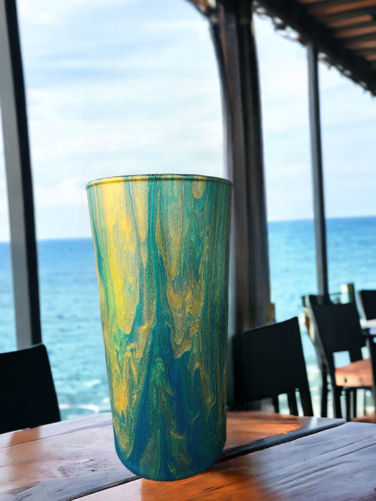 Enchanting Hand-Pour Painted Glass Flower Vase for Home & Office - 7 Inches tall- One-of-a-Kind Artistry by WanderLost Artz - Gold Teal