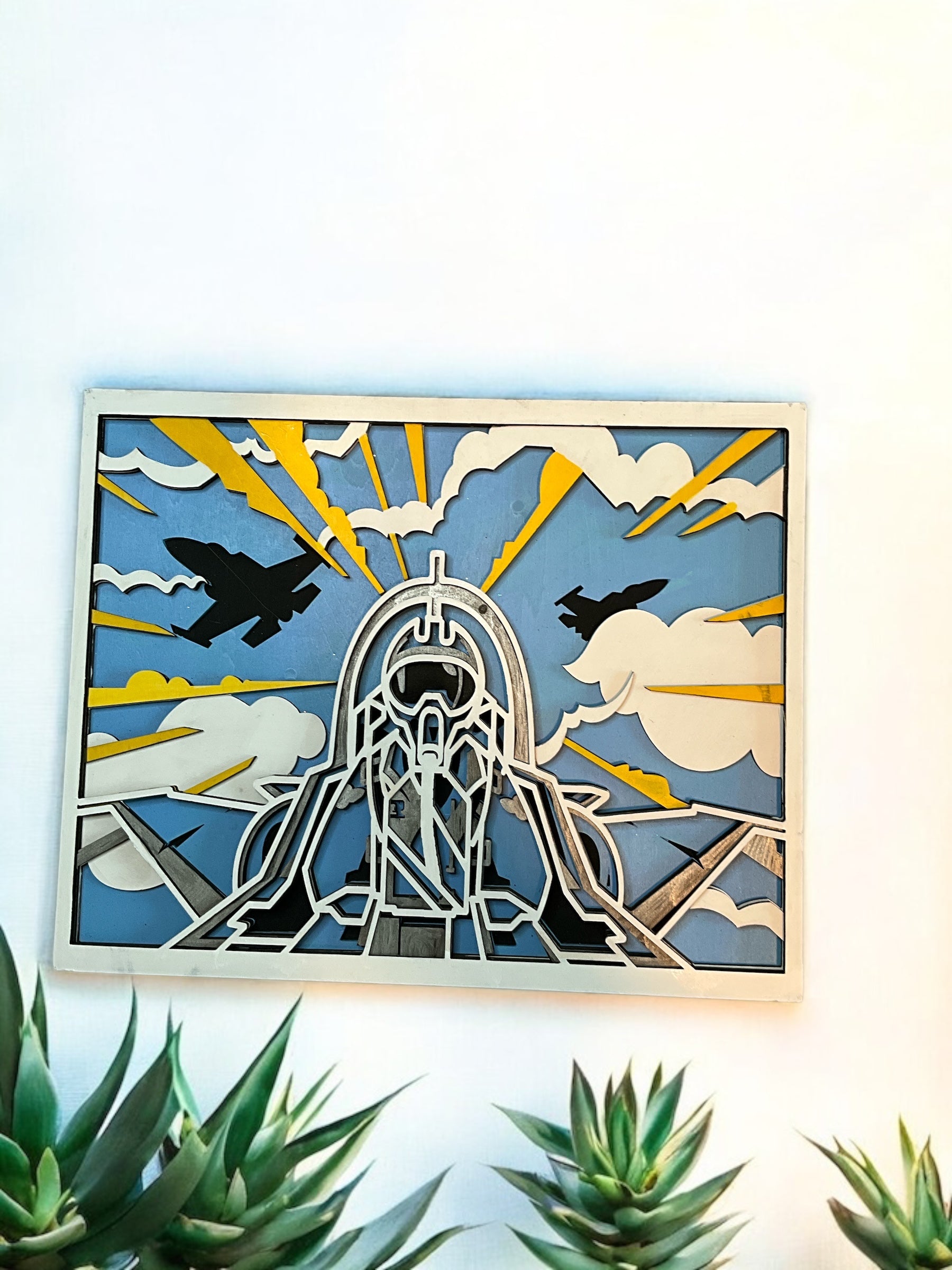 Soar into adventure with this handcrafted Air Force-inspired fighter jet wall art, designed to capture the thrill and precision of flight. Boldly styled and layered for depth, this piece embodies strength, courage, and the spirit of the skies, making it a standout addition to any military or aviation-themed space.